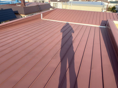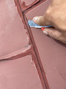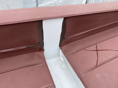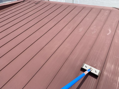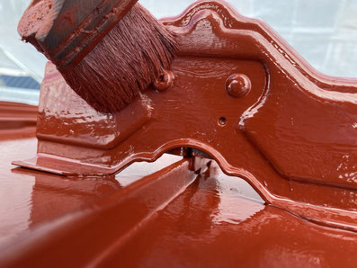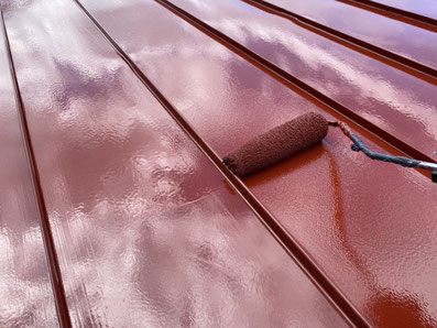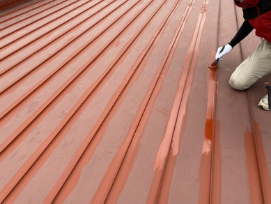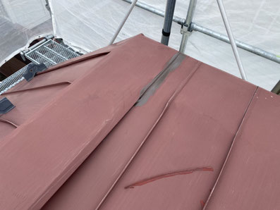 屋根材の継ぎ目を一本一本丁寧に刷毛で仕上げていきます。