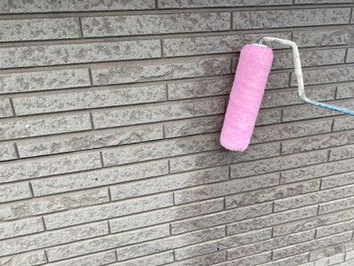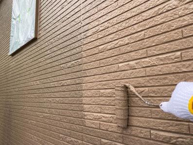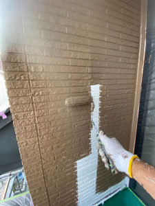 まず1回目の外壁下塗り工事です。1回目の下塗りは塗料の吸い込み防止、密着性能の高い材料を使用しました。